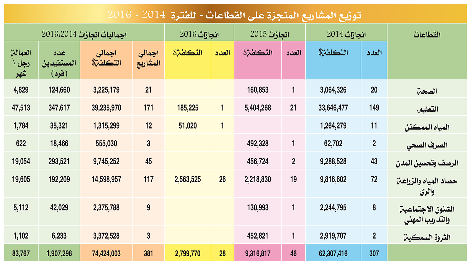 | القطاعات | المشاريع المنجزة | العمالة المحققة - يوم عمل | عدد المستفيدن من السكان (المشاريع المنجزة) | |||